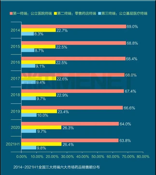 2021年上半年我國(guó)三大終端六大市場(chǎng)(定義范圍詳見文末“數(shù)據(jù)說明”)藥品銷售額達(dá)8393億元,同比增長(zhǎng)8.8%。從實(shí)現(xiàn)藥品銷售的三大終端的銷售額分布來看,公立醫(yī)院終端市場(chǎng)份額最大,2021上半年占比為63.8%;零售藥店終端市場(chǎng)份額2021上半年占比為26.4%;公立基層醫(yī)療終端市場(chǎng)份額2021上半年占比為9.8%。以上統(tǒng)計(jì)數(shù)據(jù)未包含“民營(yíng)醫(yī)院、私人診所、村衛(wèi)生室”。